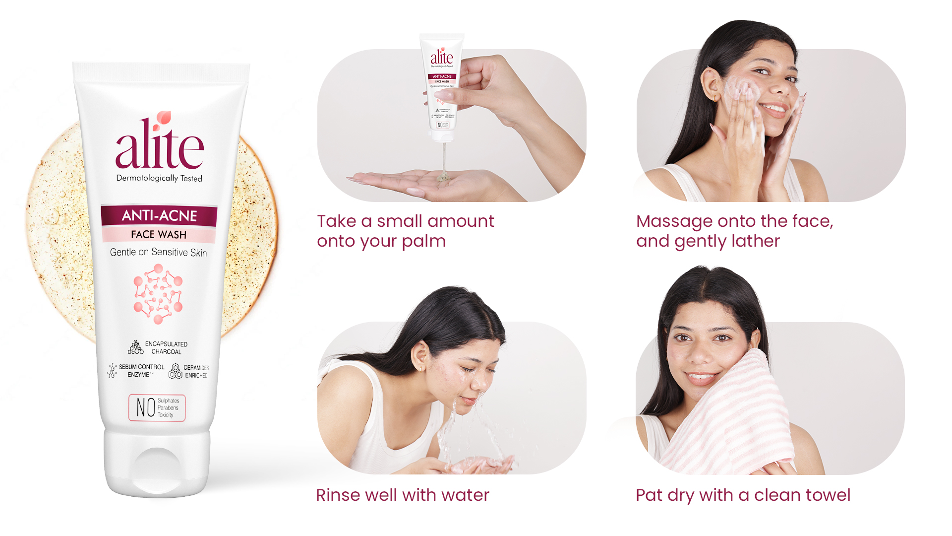 Wet your face, apply a small amount of the facewash, gently massage it into your skin, and rinse thoroughly with water.