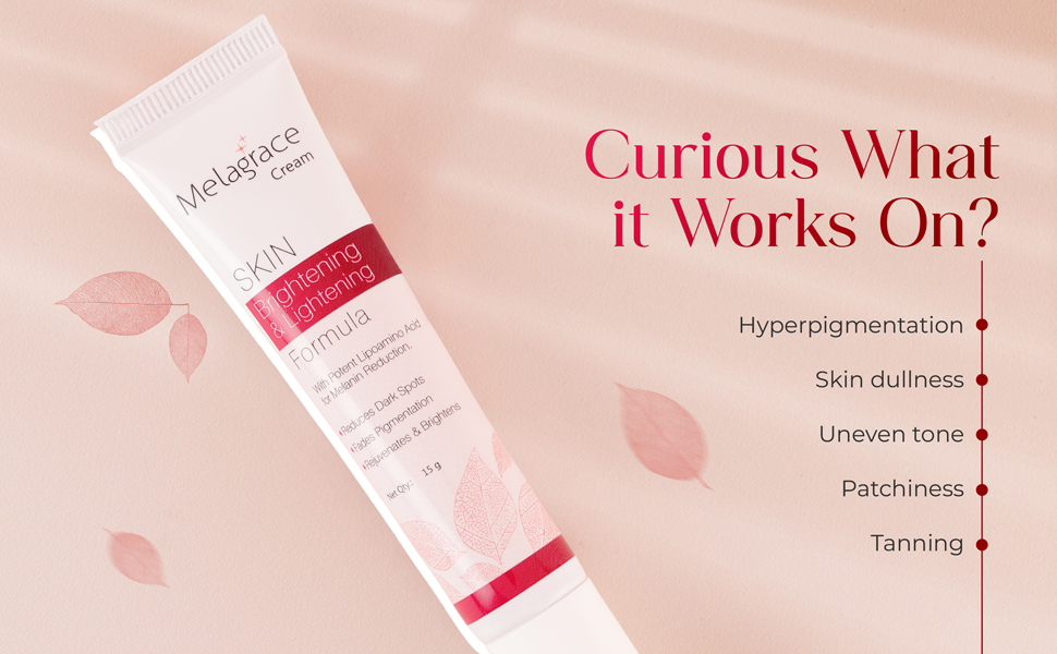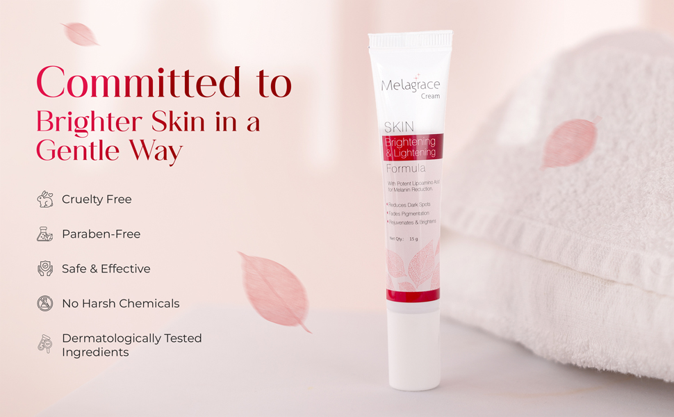 Unleash your radiant skin with Melagrace Skin Brightening & Lightening Cream! This lightweight formula is packed with natural extracts and advanced ingredients to tackle dark spots and uneven skin tone. It fades away hyperpigmentation, leaving you with a noticeably brighter, clearer complexion in just days. The potent Lipoamino Acid works effectively to reduce melanin production, while key ingredients like Licorice Extract and Niacinamide nourish and revitalize your skin. Free from parabens and harsh chemicals.A gentle cream formulated with nutrients that helps to lighten the skin tone and prevent skin darkening while keeping the skin nourished and healthy.