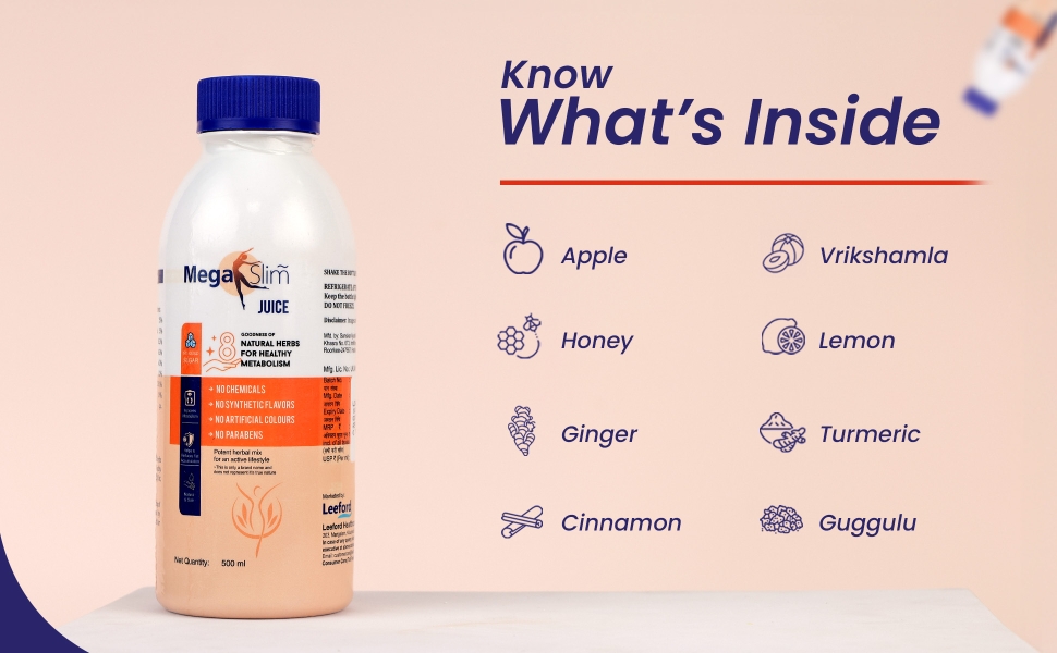 MegaSlim Juice is a natural herbal blend crafted with 8 powerful herbs, including ginger, cinnamon, turmeric, lemon, and honey, to support a healthy metabolism. This juice is free from chemicals, synthetic flavors, artificial colors, and parabens, making it a safe and healthy choice. With no added sugar, it fits perfectly into a balanced lifestyle. The 500ml pack is convenient for regular use, ensuring you stay consistent in your wellness journey. Simply mix 10–20 ml in warm or plain water and consume once or twice daily, or as advised by your healthcare professional. For best results, refrigerate after opening, keep the bottle tightly sealed, and store it in a cool, dry place away from direct sunlight.